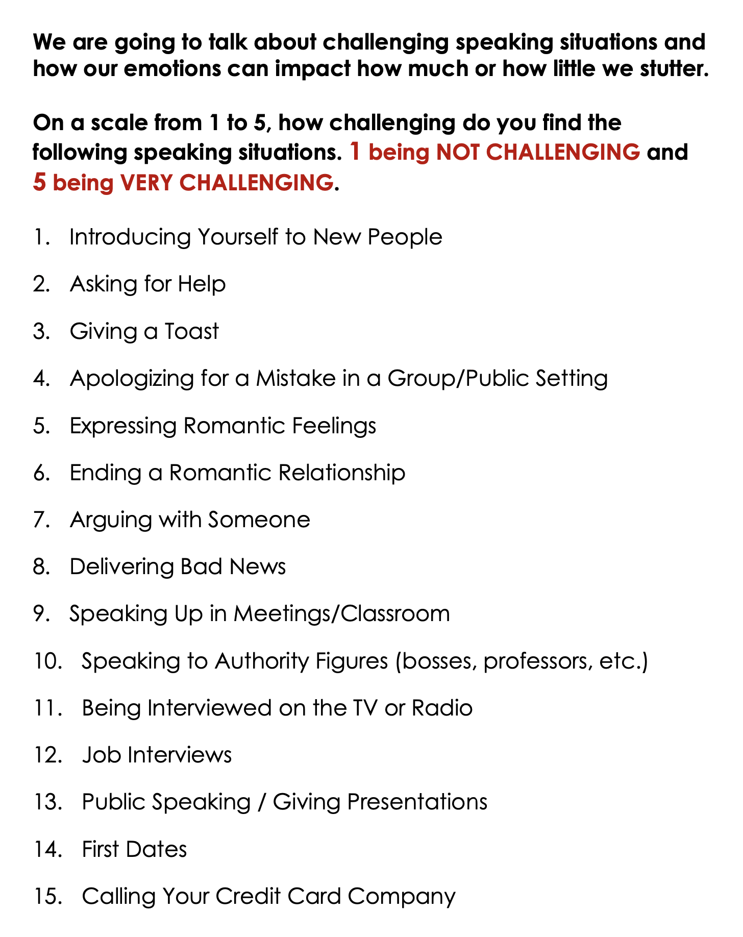 We met on Zoom with 5 people attending. (4 people who stutter and an SLP student.) After introductions, we focused on our meeting topic of “Challenging Speaking Situations.” We did an activity on Zoom sharing how challenging we find various speaking situations.